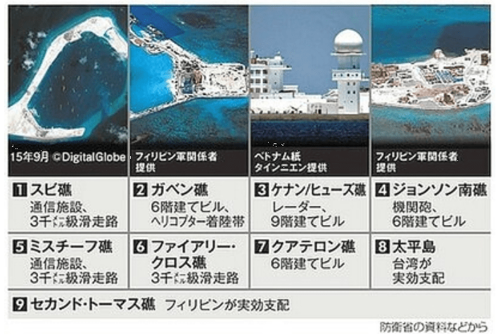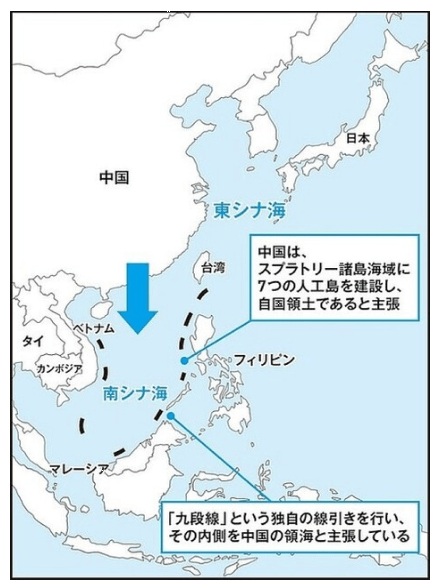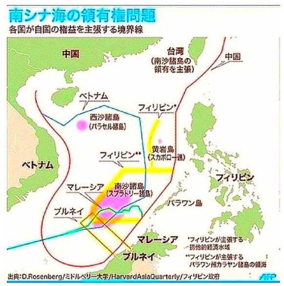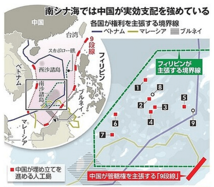 マルコス大統領は悟るべきだ。習近平は信用できない。中国は協定を破るのが常だ。相手の警戒心を解くために、見せかけだけの書類に署名する。そして、秘密裏に事を進める。習主席は陰謀渦巻く中国共産党のトップだと、マニラ新聞は書いている、、、中国はアセアン諸国と合意した、相互が南シナ海の平和維持に努力することの確認である「2002年南シナ海行動宣言」が在るにもかかわらず、南シナ海にある25カ所の岩礁や砂州を奪取、比のミスチーフ礁とベトナムのウッディー島を要塞化し、また2005~08年における比海底部の石油・鉱物の共同探査事業の結果を比に対し非公開にし、その調査結果を元に九段線を設定した。