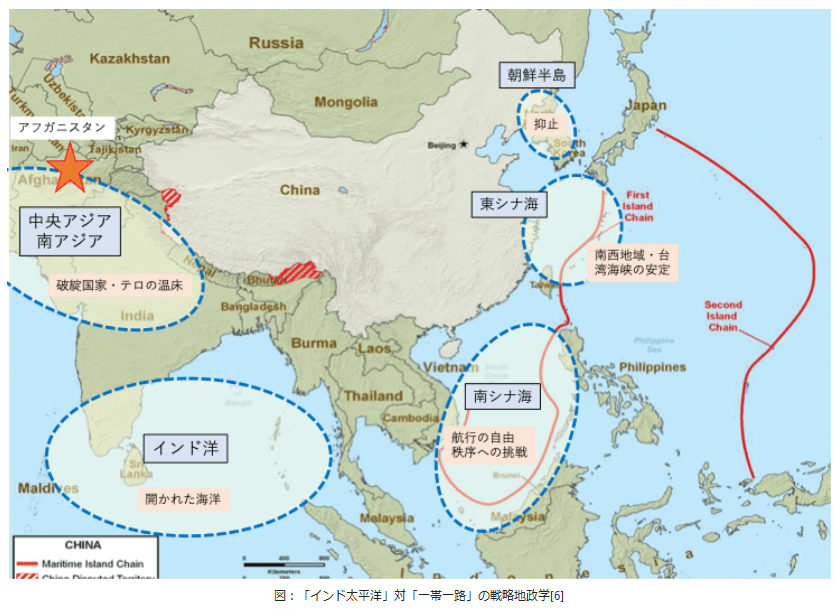 日米両国が実現を目指す「自由で開かれたインド太平洋(FOIP: Free and Open Indo-Pacific)」は、成長著しい「アジア」と潜在力溢れる「アフリカ」を繋ぐ「太平洋」と「インド洋」の交わりに生まれるダイナミズムに着目した考え方であり、この地域の発展を通じ新たな地平を切り拓くことが狙いだ。このために ① 法の支配、航行の自由等の基本的価値の普及・定着、② 経済的繁栄の追求、③ 平和と安定の確保を目指す[2]。一方、中国の「一帯一路」もアジアから欧州・アフリカにかけての地域をカバーする広域経済圏構想で、この地域の潜在力と域内に所在する経済を繋ぐことによる効果に着目している[3]。両者が展望する地域には重なりがあり、両者が協力し得る側面を持つ一方、利害が対立する場面もあり得る。また、安全保障上の危険を内包する地域を含んでおり、両者が目指す発展を実現するためには、まず平和と安定が前提となる。日米両国にとって、台頭する中国に向き合っていく上で、この広大な地域の戦略環境を的確に認識することが肝要だ。特に、日本は、自らが「インド太平洋」と「一帯一路」の交わる東北端にあって、両者にとって重要な海域のはじまりとなる東シナ海の戦略的意味を正面から捉え、その安定のためにできることを真剣に考えなければならない。