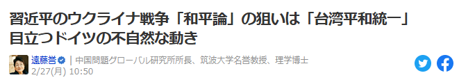 『ウクライナ戦争に対する習近平が発布した「和平論」の狙いは、来年の台湾総統選で親中の国民党を勝たせ、自分の任期中に台湾平和統一を達成することだ。各国の反応は予想通りだが、ドイツのショルツ首相の不自然さが際立っている。背景には何が?