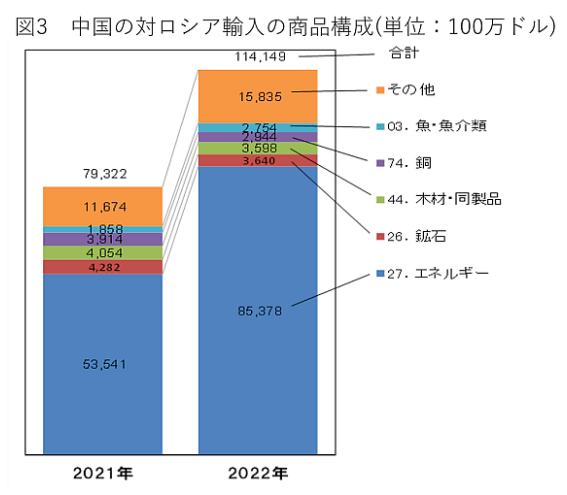 ロシアから中国向けには、2019年12月に天然ガスパイプライン「シベリアの力」が稼働し、ロシアの対中輸出量は、2022年に155億立法メートルとなり、ロシアのパイプラインガス輸出全体の15%ほどを占めるまでになっている。このほか、2022年にはロシアから中国への石炭および液化天然ガス(LNG)の輸出も顕著に拡大した。過去ブログ:2023年2月ロシア天然ガス独り占めの中国の大国化に世界は警戒