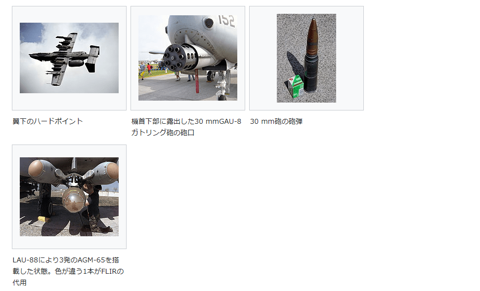 また、劣化ウランを弾芯とした30 mm徹甲弾を使用するGAU-8 アヴェンジャーガトリング砲を主要武器として内蔵している。