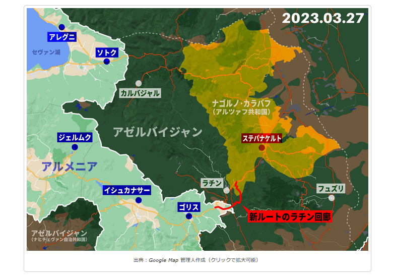 アゼルバイジャン軍は「違法な武装グループ(アルツァフ共和国のこと)がアルメニアからアゼルバイジャン領(ナゴルノ・カラバフ地域のこと)に武器や弾薬を運び込んでいる」と主張し、新ラチン回廊の封鎖箇所を迂回するルートを実力行使で封鎖、この地域は停戦協定上「アルツァフ共和国の支配領域」なのでロシアの平和維持部隊が「元の位置に下がれ」と交渉を行っているらしい。