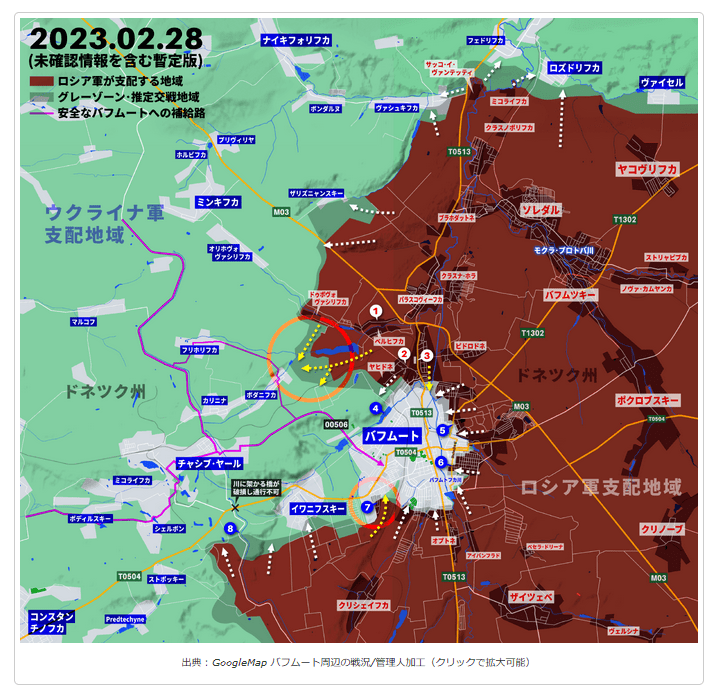 出典:GoogleMap バフムート周辺の戦況/管理人加工(クリックで拡大可能)