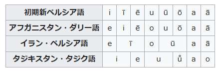 初期新ペルシア語 i ī ē u ū ō a ā アフガニスタン・ダリー語 e i ē o u ō a ā イラン・ペルシア語 e ī o ū a ā タジキスタン・タジク語 i e u ů a o