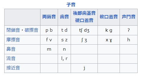 子音 両唇音 歯音 後部歯茎音 硬口蓋音 軟口蓋音 声門音 閉鎖音・破擦音 p b t d tʃ dʒ k ɡ ʔ 摩擦音 f v s z ʃ ʒ x ɣ h 鼻音 m n 流音 l, r 接近音 j