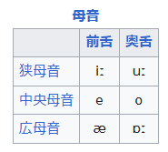 母音 前舌 奥舌 狭母音 iː uː 中央母音 e o 広母音 æ ɒː