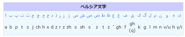 ペルシア文字 ا ب پ ت ث ج چ ح خ د ذ ر ز ژ س ش ص ض ط ظ ع غ ف ق ک گ ل م ن و ه ی a b p t s j ch h x d z r z zh s sh s z t z ’ gh f gh (q) k g l m n v/u h y/i