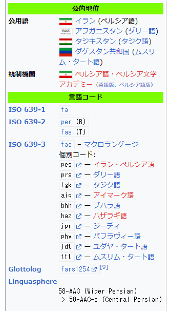 言語コード ISO 639-1 fa ISO 639-2 per (B) fas (T) ISO 639-3 fas – マクロランゲージ 個別コード: pes — イラン・ペルシア語 prs — ダリー語 tgk — タジク語 aiq — アイマーク語 bhh — ブハラ語 haz — ハザラギ語 jpr — ジーディ phv — パフラヴィー語 jdt — ユダヤ・タート語 ttt — ムスリム・タート語 Glottolog fars1254[9] Linguasphere 58-AAC (Wider Persian)