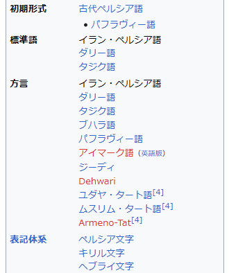 標準語 イラン・ペルシア語 ダリー語 タジク語 方言 イラン・ペルシア語 ダリー語 タジク語 ブハラ語 パフラヴィー語 アイマーク語(英語版) ジーディ Dehwari ユダヤ・タート語[4] ムスリム・タート語[4] Armeno-Tat[4] 表記体系