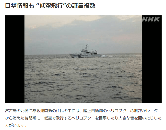 宮古島の北側にある池間島の住民の中には、陸上自衛隊のヘリコプターの航跡がレーダーから消えた時間帯に、低空で飛行するヘリコプターを目撃したり大きな音を聞いたりした人がいます。