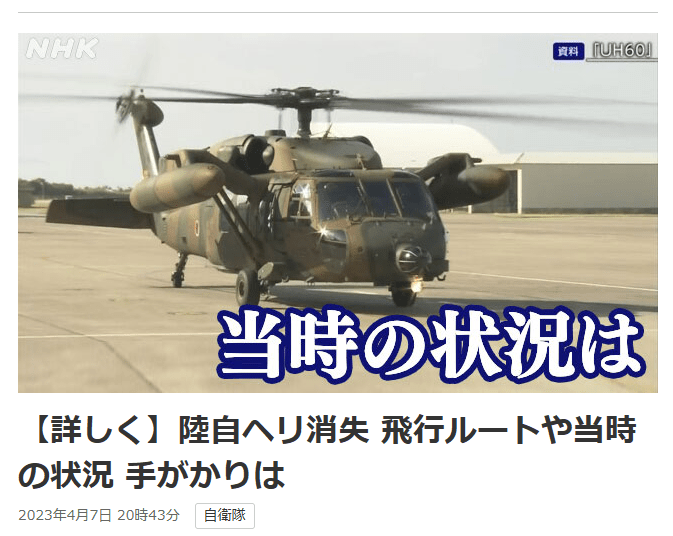 『6日午後、陸上自衛隊のヘリコプターが沖縄県の宮古島の周辺で消息を絶ちました。