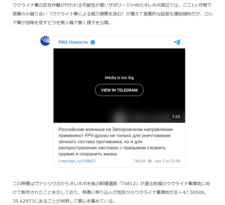 ウクライナ軍の反攻作戦が行われる可能性が高いザポリージャ州のオレホボ周辺では、ここ1ヶ月間で両軍の小競り合い(ウクライナ軍による威力偵察を含む)が増えて視覚的な証拠も増加傾向だが、ロシア軍が投降を促すビラを無人機で撒く様子を公開。