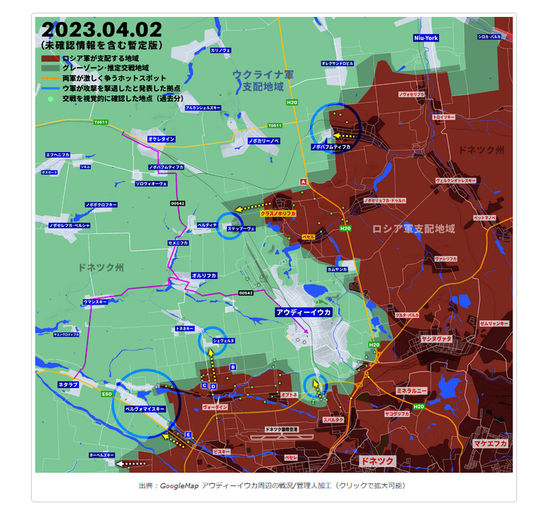 出典:GoogleMap アウディーイウカ周辺の戦況/管理人加工(クリックで拡大可能)