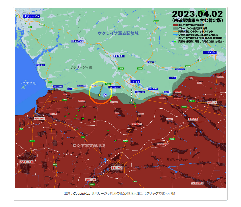 出典:GoogleMap ザポリージャ周辺の戦況/管理人加工(クリックで拡大可能)