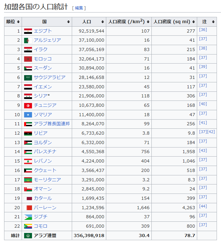 総計 アラブ連盟の旗 アラブ連盟 356,398,918 30.4 78.7