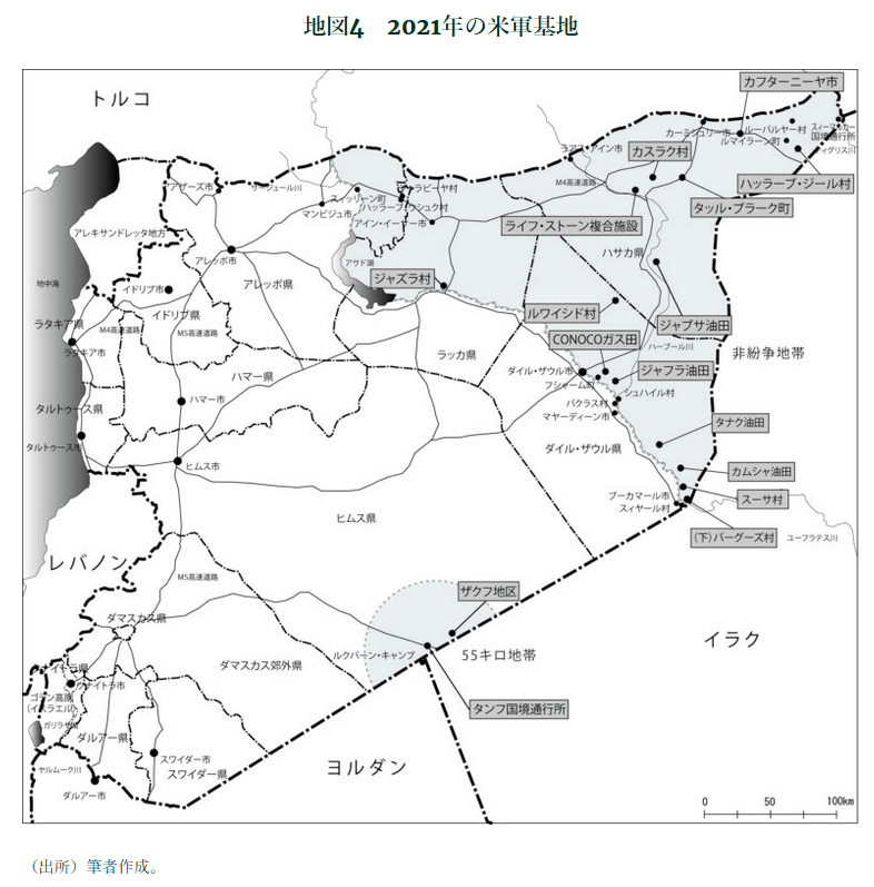 青山弘之[2016]「米軍の軍事教練を受けたシリアの「穏健な反体制派」が再活性化か?」Yahoo! Japanニュース(個人)、3月9日(https://news.yahoo.co.jp/byline/aoyamahiroyuki/20160309-00055217). ――― [2021]「バイデン米政権初の爆撃に便乗して、ロシア、シリア政府、トルコ、イランがシリアで「暴力の国際協調」」Yahoo! Japanニュース(個人)、2月27日(https://news.yahoo.co.jp/byline/aoyamahiroyuki/20210227-00224784). ――― [2021b]「所属不明のドローン、トルコ軍ドローン、ロシア軍と思われる戦闘機がシリア各地を相次いで爆撃」Yahoo! Japanニュース(個人)、5月1日(https://news.yahoo.co.jp/byline/aoyamahiroyuki/20210501-00235728). ――― [2021c]「シリアを主戦場として爆撃・砲撃の応酬を激化させる米国と「イランの民兵」」Yahoo! Japanニュース(個人)、6月29日(https://news.yahoo.co.jp/byline/aoyamahiroyuki/20210629-00245365). ――― [2021d]「シリア・イラクで頻発する米軍基地を狙った砲撃、ドローン攻撃:効果なき米国の爆撃」Yahoo! Japanニュース(個人)、7月8日(https://news.yahoo.co.jp/byline/aoyamahiroyuki/20210708-00246958). ――― [2021e]「シリアで暴力の連鎖が再発か?:ダマスカスでテロ、シリア軍とトルコ軍の攻撃激化、米軍基地にドローン攻撃」Yahoo! Japanニュース(個人)、10月21日(https://news.yahoo.co.jp/byline/aoyamahiroyuki/20211021-00264184). Alalam[2016]“Bi-al-Ṣuwar .. Tafāṣīl al-Qawāʻid al-Amīrikīya al-Mawjūda Shamāl Sūriyā,” September 21 (https://www.alalam.ir/news/1864189/%D8%A8%D8%A7%D9%84%D8%B5%D9%88%D8%B1%D8%A9–%D8%AA%D9%81%D8%A7%D8%B5%D9%8A%D9%84-%D8%A7%D9%84%D9%82%D9%88%D8%A7%D8%B9%D8%AF-%D8%A7%D9%84%D8%A7%D9%85%D9%8A%D8%B1%D9%83%D9%8A%D8%A9-%D8%A7%D9%84%D9%85%D9%88%D8%AC%D9%88%D8%AF%D8%A9-%D8%B4%D9%85%D8%A7%D9%84-%D8%B3%D9%88%D8%B1%D9%8A%D8%A7 ). Aljazeera.net[2016]“al-Qāʻida al-Barīṭānīya fī Sūriyā .. al-Mawqiʻ wa al-Ahdāf,” August 16 (https://www.aljazeera.net/encyclopedia/military/2016/8/14/%D8%A7%D9%84%D9%82%D8%A7%D8%B9%D8%AF%D8%A9-%D8%A7%D9%84%D8%A8%D8%B1%D9%8A%D8%B7%D8%A7%D9%86%D9%8A%D8%A9-%D9%81%D9%8A-%D8%B3%D9%88%D8%B1%D9%8A%D8%A7-%D8%A7%D9%84%D9%85%D9%88%D9%82%D8%B9 ). Anadolu Ajansı[2018b]“Suriye’deki Fransız Askeri Varlığı,” December 26 (https://www.aa.com.tr/tr/dunya/suriyedeki-fransiz-askeri-varligi/1349000 ). ――― [2020]“al-Qūwāt al-Amrīkīya Tabnī Qāʻida ʻAskarīya fī al-Ḥasaka al-Sūrīya,” February 8 (https://www.aa.com.tr/ar/%D8%A7%D9%84%D8%AF%D9%88%D9%84-%D8%A7%D9%84%D8%B9%D8%B1%D8%A8%D9%8A%D8%A9/%D8%A7%D9%84%D9%82%D9%88%D8%A7%D8%AA-%D8%A7%D9%84%D8%A3%D9%85%D8%B1%D9%8A%D9%83%D9%8A%D8%A9-%D8%AA%D8%A8%D9%86%D9%8A-%D9%82%D8%A7%D8%B9%D8%AF%D8%A9-%D8%B9%D8%B3%D9%83%D8%B1%D9%8A%D8%A9-%D9%81%D9%8A-%D8%A7%D9%84%D8%AD%D8%B3%D9%83%D8%A9-%D8%A7%D9%84%D8%B3%D9%88%D8%B1%D9%8A%D8%A9/1728165 ). ANHA[2021] “Suqūṭ Qadhīfatayn Ṣārūkhatayn ʻGharbī Ḥaql al-ʻUmar bi-Rīf Dayr al-Zawr,” July 4 (https://hawarnews.com/ar/haber/sqwt-qthyftyn-sarwkhytyn-ghrby-hql-alamr-bryf-dyr-alzwr-h52328.html ). ʻAssāf, Khalīl[2016]“al-Qawāʻid al-Amīrikīya fī Sūriyā: Dawr Mustaqbalī,” Almodon, October 9 (https://www.almodon.com/amp/arabworld/2016/10/9/%D8%A7%D9%84%D9%82%D9%88%D8%A7%D8%B9%D8%AF-%D8%A7%D9%84%D8%A3%D9%85%D9%8A%D8%B1%D9%83%D9%8A%D8%A9-%D9%81%D9%8A-%D8%B3%D9%88%D8%B1%D9%8A%D8%A7-%D8%AF%D9%88%D8%B1-%D9%85%D8%B3%D8%AA%D9%82%D8%A8%D9%84%D9%8A ). Barrett, Evan[2017]“Maintaining the U.S. CT Mission in Southern Syria,” The Washington Institute for Near East Policy, August 28 (https://www.washingtoninstitute.org/policy-analysis/maintaining-us-ct-mission-southern-syria ). Dellal, Adel[2019]“Taʻarruf ʻalā Manāṭiq Tawājud al-Qūwāt al-Ajnabīya fī Sūriyā wa Abraz Qawāʻid al-ʻAskarīya,” Euro News Arabic, October 10 (https://arabic.euronews.com/2019/10/09/what-are-the-most-prominent-military-bases-and-points-in-syria ). al-Durār al-Shāmīya[2021] “Maṣdar-hu Manāṭiq al-Mīlīshiyāt al-Īrānīya .. Qaṣf Ṣārūkhī Yastahdif Qāʻida Amrīkīya Jadīda bi-Rīf Dayr al-Zawr,” August 31 (https://eldorar.com/node/167794 ). Facebook (https://www.facebook.com/ ). @euphrateseye Fox News[2021]“US downs drone over Syria believed launched by Iranian-backed militias,” December 16 (https://www.foxnews.com/world/us-downs-drone-over-syria-believed-launched-by-iranian-backed-militias ). Griffin, Jennifer and Singma, Brooke[2021]“US Troops in Syria Targeted with ‘Deliberate and Coordinated’ Drone Attack, No Injuries Reported,” Fox News, October 21 (https://www.foxnews.com/politics/us-troops-in-syria-drone-attack-no-injuries-reported ). al-Ḥāmid, Rāʼid[2017]“al-Tawājud al-ʻAskarī al-Amīrikī fī Sūriyā Ghāyāt-hā wa Āfāq-hu al-Mustaqbalīya,” Alalam, November 3 (https://alaalam.org/ar/politics-ar/syria-ar/item/599-611031117.html ). Jumayda, Bassām[2020]“al-Qawāʻid al-ʻAskarīya al-Amrīkīya fī Sūriyā .. al-Makān wa al-Dawr,” Oman Daily, July 1 (https://www.omandaily.om/%D8%AA%D9%82%D8%A7%D8%B1%D9%8A%D8%B1/%D8%A7%D9%84%D9%82%D9%88%D8%A7%D8%B9%D8%AF-%D8%A7%D9%84%D8%B9%D8%B3%D9%83%D8%B1%D9%8A%D8%A9-%D8%A7%D9%84%D8%A3%D9%85%D8%B1%D9%8A%D9%83%D9%8A%D8%A9-%D9%81%D9%8A-%D8%B3%D9%88%D8%B1%D9%8A%D8%A7-%D8%A7 ). Jusūr li-l-Dirāsāt[2020]“Kharīṭa Tuwazziʻ al-Qūwāt al-Amrīkīya fī Sūrīya,” February 24 (https://www.jusoor.co/public/details/%D8%AE%D8%B1%D9%8A%D8%B7%D8%A9-%D8%AA%D9%88%D8%B2%D8%B9-%D8%A7%D9%84%D9%82%D9%88%D8%A7%D8%AA-%D8%A7%D9%84%D8%A7%D9%85%D8%B1%D9%8A%D9%83%D9%8A%D8%A9-%D9%81%D9%8A-%D8%B3%D9%88%D8%B1%D9%8A%D8%A9-24-02-2020/578/ar ). ――― [2021]“Niqāṭ al-Quwā al-Khārijīya fī Sūrīya: Nihāya 2021 wa Bidāya 2022,” December 27 (https://jusoor.co/content_images/users/5/contents/1633.pdf ). Markaz Harmūn li-Dirāsāt al-Muʻāṣira[