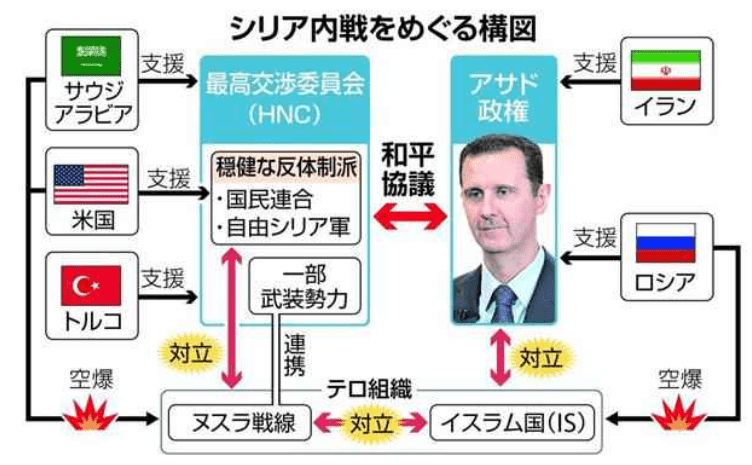 米国は、2011年3月に「アラブの春」がシリアに波及すると、人道に基づいてシリア政府による抗議デモ弾圧を厳しく非難し、その正統性を否定、退陣を迫った。バラク・オバマ政権は、西欧諸国、アラブ湾岸諸国、トルコとともにシリアに経済制裁を科し、政府の弱体化を狙うとともに、反体制活動家や政治組織、さらには武装集団を支援した。中央情報局(CIA)は2013年初め頃から、英国、フランス、ヨルダン、サウジアラビアの軍・諜報機関とともに「軍事作戦司令部」(Military Operations Command:通称MOC)を創設し、ヨルダン国内で反体制派に極秘軍事教練を行う一方、国内(ダルアー県、イドリブ県、アレッポ県)で活動する南部軍、イッザ軍、ナスル軍、ヌールッディーン・ザンキー運動といった武装集団を後援した[1]。
