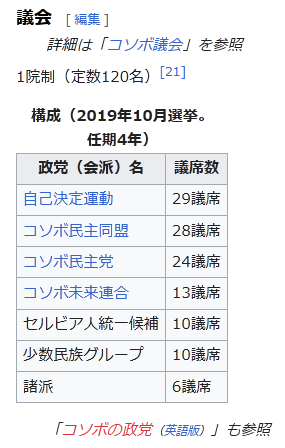 1院制(定数120名)[21] 構成(2019年10月選挙。 任期4年) 政党(会派)名 議席数 自己決定運動 29議席 コソボ民主同盟 28議席 コソボ民主党 24議席 コソボ未来連合 13議席 セルビア人統一候補 10議席 少数民族グループ 10議席 諸派 6議席 「コソボの政党(英語版)」も参照 軍事