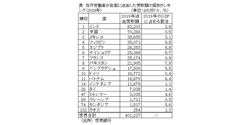 表 在外労働者が自国に送金した受取額の国別ランキング(2019年)
