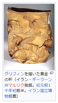 グリフィンを描いた黄金の杯(イラン・ギーラーン州マルリク発掘。紀元前1千年紀前半。イラン国立博物館蔵)
