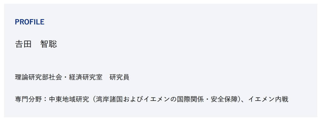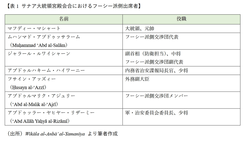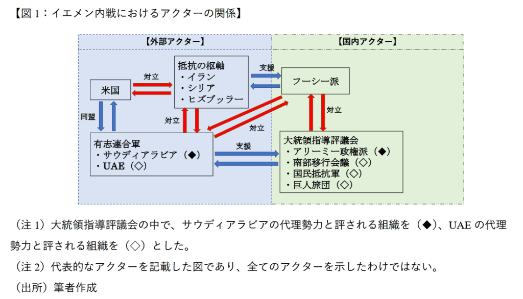 そのため本「イエメン情勢クオータリー」シリーズを通して、イエメン情勢に関する定期的な情報 発信を試みる。 ・ ノヾツクナンノヾー 吉田智聡「8年目を迎えるイエメン内戦一リヤド合意と連合抵抗軍台頭の内戦への影響ー」『NIDSコメンタリー』第209号、 防衛研究所(2022年3月15日). —-「イエメン情勢クオータリー(2023年1月〜3月)ーイラン・サウディアラビア国交正常化合意の焦点としてのイエ メン内戦? ー」『NIDSコメンタリー』第258号、防衛研究所(2023年4月20日). 1″al-Ra’is al-Mashat Yastaqbil al-Wafdayn al-‘UmanT wa al-Su’udT fi al-Qasr al-Jumhurl bi San’a’,” Wikala al-Anba’al-Yamariiya, April 9, 2023, https://www.saba.ye/ar/news3233686.htm. 2 Patrick Wintour, “Saudi Arabia Makes Peace Proposal for Yemen after Houthi Talks/1 2 * * 5 6 7 8 The Guardian. April10, 2023, https://www.theguardian.com/world/2023/apr/10/saudi-arabia-makes-peace-proposal-for-yemen-after-houthi-talks. 3和平交渉やイエメン情勢の展望については、以下も参照されたい。 吉田智聡「「忘れられた」イエメン内戦はどこへ向かうかーイエメン情勢を左右する3つの要因ー」『季刊アラブ』第184号、 近刊。 4サナア戦略学研究所は月刊の情勢分析(6月22日発行)にて、和平案を提示したサウディアラビアがフーシー派の給与支払 い要求を拒否しているという見立てを示しており、和平交渉の具体的な内容や争点については公開情報では不明な点がある。 “Southern Transitional Council Resurgent/5 Sana “a Center for Strategic Studies. June 22, 2023, https://sanaacenter.org/the-yemen- review/may-2023/203 86. 5 ccal-Liwa? al-Hakim YaltaqT al-Mustashar al-“Askarili al-Mumaththil al-Umami al-Khass ila al-Yaman,” Wikala al-Anba,al-Yamaniya. May 7, 2023, https://www.saba.ye/ar/news3238650.htm. 6 “Inhisar Furas al-Salam fT al-Yaman bi Sabab al-Tadakhkhulat al-Amnklya,55 Wikala al-Anba}al-Yamaniya. June 10, 2023, https://www.saba.ye/ar/news3245517.htm. 7 “al-Ra’is al-Mashat: Idha Istamarra al-cAduw fi cInad-hi fa Huwa YudTc al-Furas wa alladhT Yu’rad calay-hi al-Yawm Lan Yunal Ghad,” Wikala al-Anba”al-Yamamya. June 22, 2023, https://www.saba.ye/ar/news3247897.htm. 8 「平和でも戦争でもない」状態(Hala al-La Salm waal-LaHarb)とは、2022年10月の停戦合意失効以後、停戦合意の再開や 和平合意の実現には至らないものの(平和でもない)、空爆や越境攻撃のような大規模な軍事衝突も再開していない(戦争でも ない)状態を指す。 -8 – NIDSコメンタリー第266号 9 「サルハ(sarkha)」はアラビア語で「叫び」を意味する語であり、フーシー派の場合は「神は偉大なり、米国に死を、イス ラエルに死を、ユダヤ人に呪いを、イスラームに勝利あれ」という同派のスローガンを叫ぶことを指す。 10 “Masira Jamahiriya Kubra fi al-‘Asima San’a5 bi al-Dhikra al-SanawTya li al-Sarkha,^^ Wikala al-Anba’al-Yamaniya, May 24, 2023, https://www.saba.ye/ar/news3242342.htm. 11″Qarar Ra’is Majlis al-Qiyada al-Ri’asi al-Qa?id al-Acla li al-Quwat al-Musallaha bi Insha5 Hay5a al-cAmalTyat al-Mushtarika/5 Wikala al- Anba ‘al-Yamamya. April 27, 2023, https://www.sabanew.net/story/ar/97205. 12 “Hay’a al-cAmalTyat bi Wizara al-Difac TuqTm Warsha “Amal bi “Unwan al-Fdad Tariq al-Nasr,55 Wikala al-Anba’al-Yamaniya. May 2, 2023, https://www.sabanew.net/story/ar/97285. 13 “Al-Bahsani Suspends His Participation in PLC’s Meetings/5 South 24, April 20, 2023, https://south24.net/news/newse.php?nid=3302. 14 “Qal inna-hu bi La Hiss Watani.. Abu Zara” a al-Muharrami Yashunn Hujum Ladhi” “ala Ra5Ts al-Hukuma Ma’in ° Abd al-Malik,55 Sihafa al- ‘Arab. June 13, 2023, https://www.sahafahh.net/story/16640264/%D9%82%D8%A7%D9%84-%D8%A5%D9%86%D9%87-%D8%A8%D9%84%D8%A7-%D8 %AD%D8%B3-%D9%88%D8%B7%D9%86%D9%8A-%D8%A3%D8%A8%D9%88-%D8%B2%D8%B1%D8%B9%D8%A9-%D8%A7 %D9%84%D9%85%D8%AD%D8%B1%D9%85%D9%8A-%D9%8A%D8%B4%D9%86. 15 “al-Ra’is al-Zubaydi Yashhad Marasim al-Tawqic cala al-Mithaq al-Watani al-Janubi,55 al-Majlis al-Intiqali al-Janubi. May 8, 2023, https: // stcaden.com/ news/20976. 16 Tian al-Mithaq al-Watani al-Janubi wa Shakl al-Dawla al-Qadima,55 South 24, May 8, 2023, https: // south24. net/news/news. php?nid=3 329. 17南部国民憲章本文については、以下を参照した。 ccal-Umana, Net Yanshir Nass al-Mithaq al-Watani al-JanUbi,” al-Umana ‘Net, May 8, 2023, https://al-omana.net/ni/details.php7idn99550. 18 “al-Ra’is al-Zubaydi fTNadwa bi “Chatham House’: Na’mal cala Istiqlal al-Janub Salmi taht Ishraf al-Umam al-Muttahida,” al-Majlis al- Intiqali al-Janubi. June 22, 2023, https://stcaden.com/news/21449. 19 “‘Ajil Mu’tamar Hadramawt al-Jamic Yusdir Bayan Hamm hawl al-Liqa’ al-Tashawuri li al-Mukawwinat al-Janubiya fi al-Rabic min Mayu,” Shamsan Net. April 29, 2023, https://www.shmsan.net/news/30278.; ccal-I’tilaf al-Watani al-Janubi YuC1 in “Adam Musharaka-hi fT al- Liqa’ al-Tashawuri Alladhi Da”a la-hu al-Intiqali,” al-Harf 28. May 3, 2023, https://alharf28.com/p-86875. 20旧南イエメンの派閥形成の過程や対立構造については、以下が詳しい。 Fred Halliday, Revolution and Foreign Policy: The Case of South Yemen 1967-1987. Cambridge: Cambridge University Press, 1990. 21ズムラ派閥の代表格として、元南イエメン大統領アリー・ナースイル・ムハンマド(cAli Nasir Muhammad,アブヤン県出 身)やハーディー(アブヤン県出身)が含まれる。 22第1軍管区はハドラマウト県北部を管轄しており、南部移行会議は敵対する「イスラー八」系部隊の同区からの撤退と自組 織系部隊への交代を要