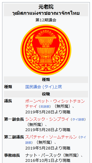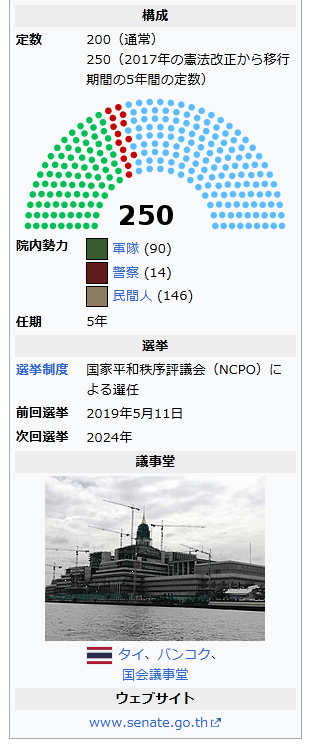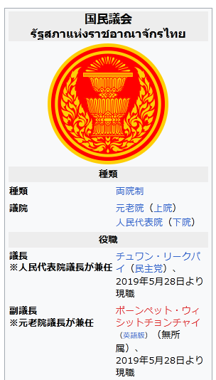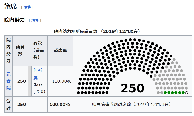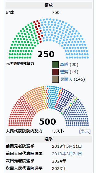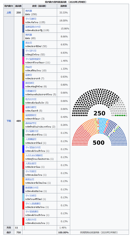 院内勢力別所属議員数 (2020年2月現在) 院内勢力 議員数 政党(議員数) 議席率 25th Thailand House of Representatives composition.svg