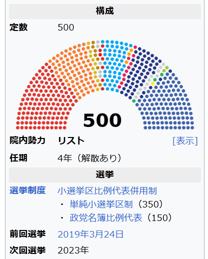 2007年 - 新憲法が公布。再設置(定員500)。小選挙区比例代表並立制(小選挙区375、比例区125)。