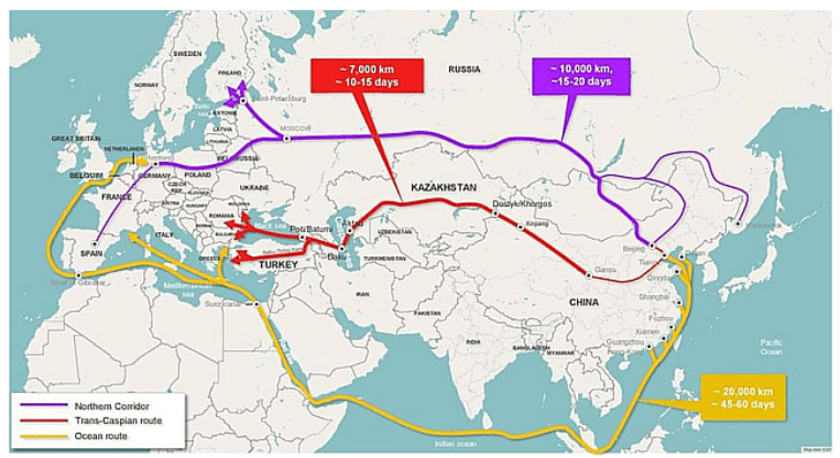 現状の中欧班列の北ルートに将来的不安があると言う事は、ウクライナ戦争前の2022年2月9日の中国記事が指摘しており、その際に代替ルートとして、海路でドイツの港への陸揚げや、「中間回廊」として、鉄路でカザフスタンからカスピ海を渡り、トルコへ入るルート等に言及しているが、いずれも日数やコスト面、軌道幅の違い等で実現には問題が多い。』