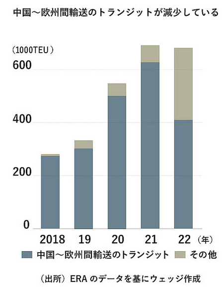 この事でロシアを除いた狭義の欧州と中国の間のコンテナ輸送量は、2021年の61.8万TEUから、2022年には38.6万TEUに低下した。、、、