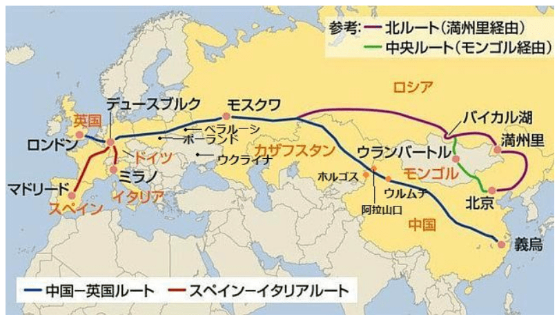img_6c7d83403af86d5ec693d483142ea46a88394 中欧班列には、複数のルートがある。主力となっているのがロシアとベラルーシを通るもので、2019年には輸送量の9割以上はこの北、中央ルート(日通も2021年から利用)であった。中国の新疆ウイグル自治区の阿拉山口、または同区のホルゴスを越えてカザフスタンに入り、広軌(レールの幅が1520ミリメートル)車両に積み替え、ロシア、ベラルーシを通過し、ベラルーシ・ポーランド国境で再度、標準軌(同・1435ミリメートル)の車両に積み替えられて、欧州各国へと運ばれていく。