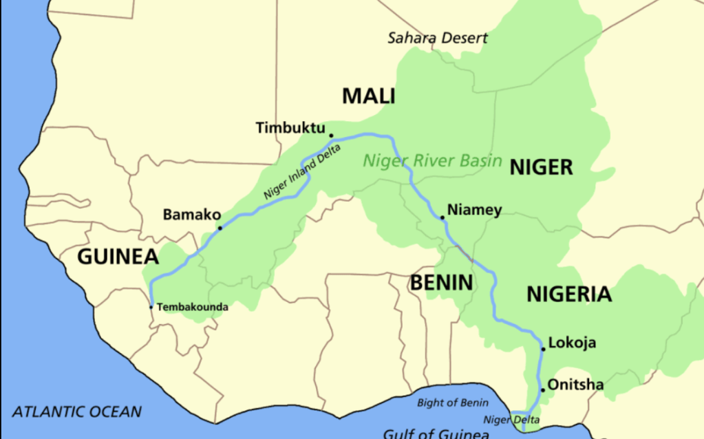 ニジェール川はギニアにある山地から流れ出てニジェール盆地で大きく湾曲してギニア湾へ注ぐ。