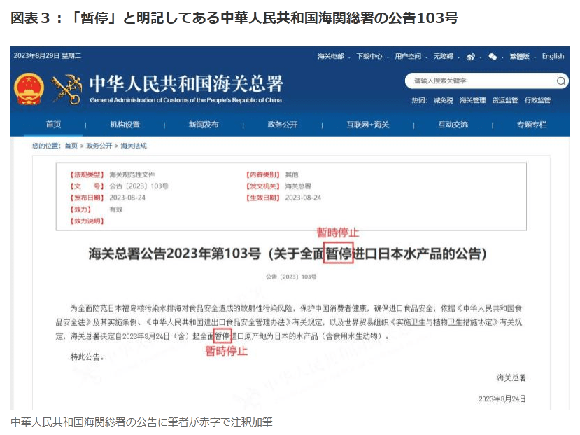 たとえば8月24日に出された中華人民共和国海関総署の2023年公告103号によれば、日本を原産地とする水産物の全面的な禁止は、あくまでも「一時的」なのである。この一時的は「暫停(暫定停止)」という言葉で表現されているのを見落としてはならない。その公告を以下に貼り付ける。