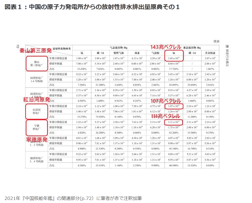 中国も日本と同様、原子力施設からトリチウム等の放射性核種を含む廃水を、IAEAが定める国際基準に従って海洋に排出している。 日本は、多核種除去設備(ALPS)処理水から海に放出されるトリチウムを毎年22兆ベクレル放出すると予想されており、これは中国浙江省の秦山原子力発電所の年間排出量の約10分の1、広東省の陽江原子力発電所、福建省の寧徳原子力発電所、広東省の紅岩河原子力発電所の年間排出量の約5分の1に相当します。