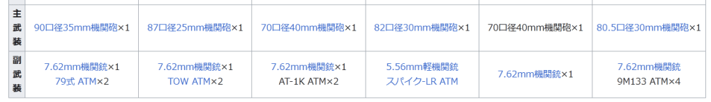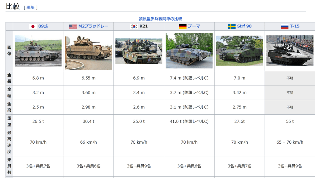 画像 全長 6.8 m 6.55 m 6.9 m 7.4 m (防護レベルC) 7.0 m 不明 全幅 3.2 m 3.60 m 3.4 m 3.7 m (防護レベルC) 3.42 m 不明 全高 2.5 m 2.98 m 2.6 m 3.1 m (防護レベルC) 2.75 m 不明 重量 26.5 t 30.4 t 25.0 t 41.0 t (防護レベルC) 27.6t 55 t 最高速度 70 km/h 66 km/h 70 km/h 70 km/h 70 km/h 65 – 70 km/h 乗員数 3名+兵員7名 3名+兵員6名 3名+兵員9名 3名+兵員6名 3名+兵員7名 3名+兵員9名 主武装 90口径35mm機関砲×1 87口径25mm機関砲×1 70口径40mm機関砲×1 82口径30mm機関砲×1 70口径40mm機関砲×1 80.5口径30mm機関砲×1 副武装 7.62mm機関銃×1 79式 ATM×2 7.62mm機関銃×1 TOW ATM×2 7.62mm機関銃×1 AT-1K ATM×2 5.56mm軽機関銃 スパイク-LR ATM 7.62mm機関銃×1 7.62mm機関銃 9M133 ATM×4
