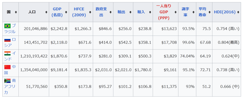国 人口 GDP (名目) HFCE (2009) 政府支出 輸出 輸入 一人当りGDP (PPP) 識字率 平均寿命 HDI(2016) ブラジルの旗 ブラジル 201,046,886 $2,242.8 $1,266.3 $846.6 $256.0 $238.8 $13,623 93.5% 75.5 0.754 (高い) ロシアの旗 ロシア 143,451,702 $2,118.0 $671.6 $414.0 $542.5 $358.1 $17,708 99.6% 67.68 0.804(最高) インドの旗 インド 1,210,193,422 $1,870.6 $737.9 $281.0 $309.1 $500.3 $3,829 74.04% 64.19 0.624(中) 中華人民共和国の旗 中国 1,354,040,000 $9,181.4 $1,835.3 $2,031.0 $2,021.0 $1,780.0 $9,161 95.1% 72.71 0.738 (高い) 南アフリカ共和国の旗 南アフリカ 51,770,560 $350.8 $173.8 $95.27 $101.2 $106.8 $11,375 93% 51.2 0.666 (中) 共通点