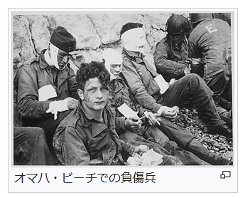 1944年6月6日、ロバート・F・サージェント撮影『死の顎へ』(en:Into the Jaws of Death)。LCVPからオマハ・ビーチに上陸する米第1歩兵師団第16歩兵連隊E中隊