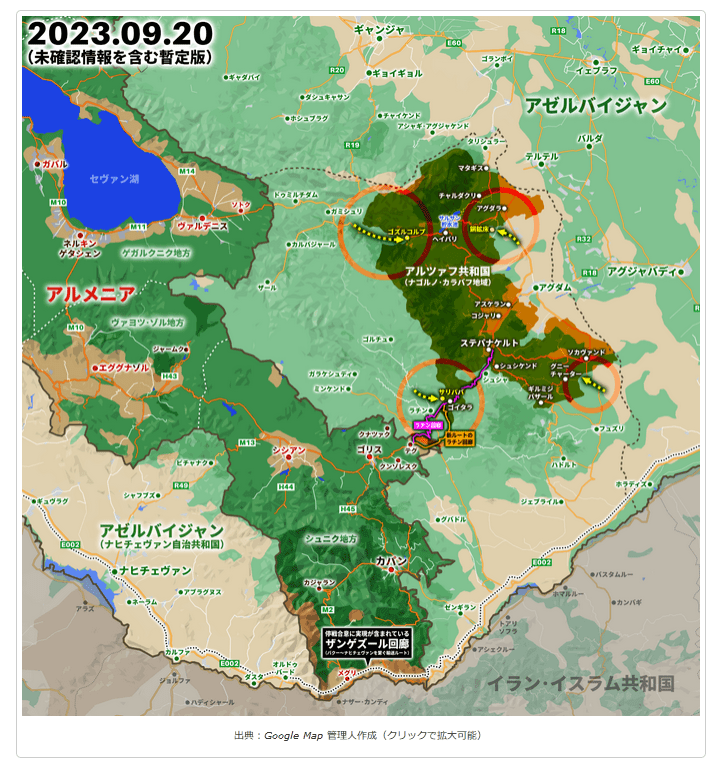 アゼルバイジャン国防省は19日「三ヶ国間声明の条項履行を確実にし、カラバフ経済地域における大規模な挑発行為を抑制し、アゼルバイジャン領からのアルメニア軍事組織(アルツァフ共和国軍のこと)の武装解除と撤退を実現するため、現地で対テロ作戦を開始した」と発表、地上部隊を投入して複数方向からアルツァフ共和国が支配する地域に侵入を開始し、アゼルバイジャン軍の圧倒的な火力に抵抗できなくなったアルツァフ共和国は20日に停戦案を受け入れ、ようやく「誰も助けてくれない」という現実を認めた。