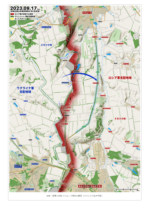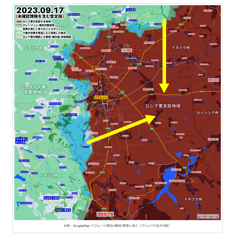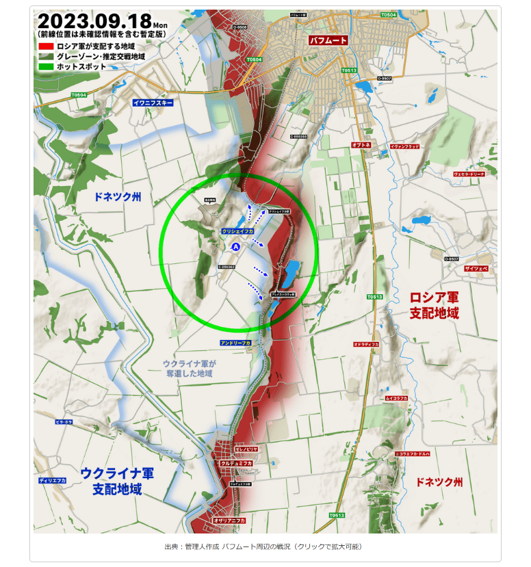 出典:管理人作成 バフムート周辺の戦況(クリックで拡大可能)