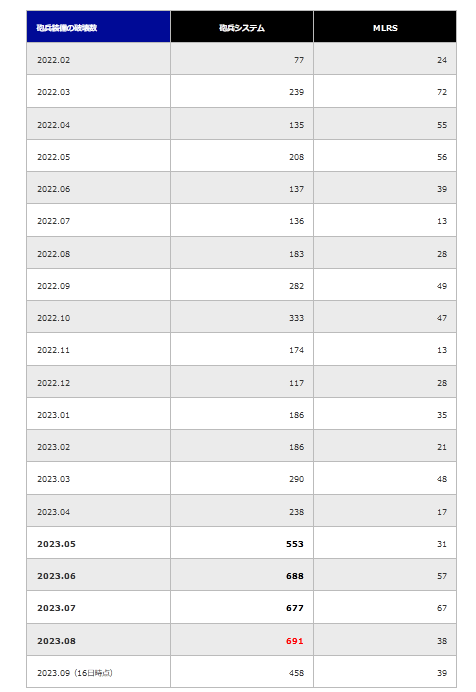 『ウクライナ軍による敵砲兵装備の破壊数は月平均191.4だったが、6月に688、8月に677、8月に691の砲兵装備を破壊、第26独立砲兵旅団も「ウクライナ軍とロシア軍の砲兵戦力は同等になりつつある」と言及した。