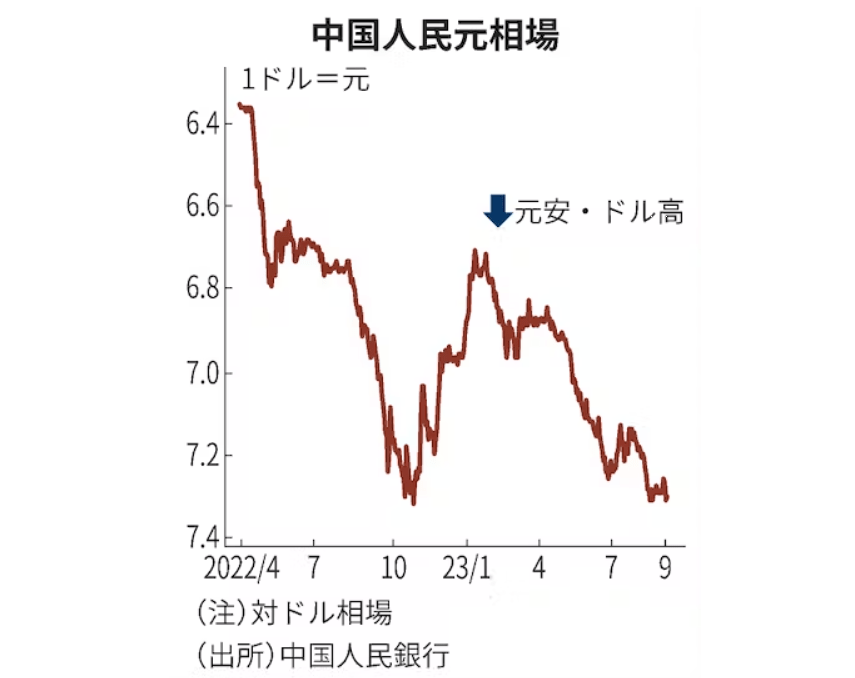 貿易黒字が減ると、貿易会社が外貨を売って人民元を買う動きが弱まる。中国国家外貨管理局が銀行口座を経由した資金の流出入額をまとめたところ、1〜7月の累計で130億ドルの流出超過だった。通年でも流出が流入を上回れば、19年以来4年ぶりとなる。