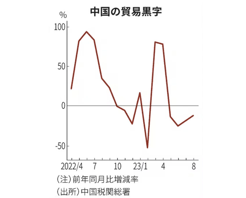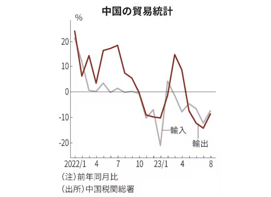 8月の日本からの輸入額は前年同月より17%少なかった。中国は東京電力福島第1原子力発電所の処理水の海洋放出に反発し、日本産の水産物輸入を全面的に停止した。SNSでは日本製化粧品の不買を呼びかける動きも出た。