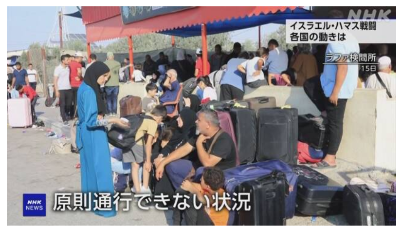 ラファ検問所は現在、原則、通行出来ない状況になっていて15日に撮影された現地からの映像では検問所が開くのを待つ大勢の人々が大きな旅行カバンなどの荷物のそばに座り込んでいます。