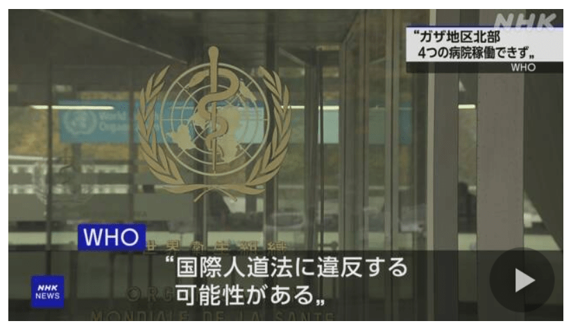 WHO=世界保健機関は15日、ガザ地区の北部にある4つの病院が、損傷したり標的にされたりして稼働できなくなったと発表しました。