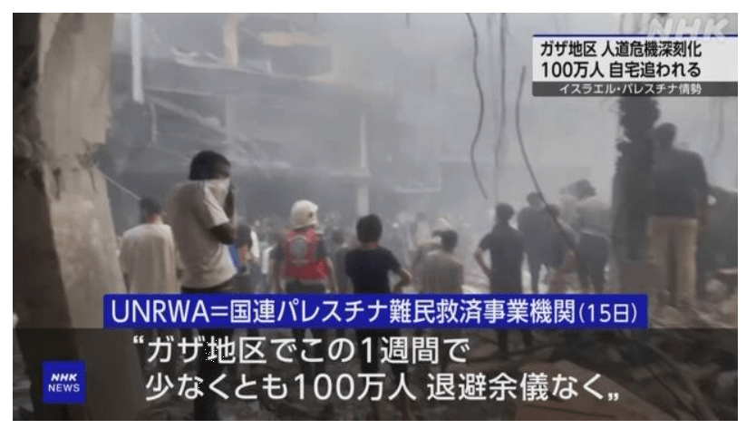パレスチナ難民を支援するUNRWA=国連パレスチナ難民救済事業機関は、15日、ガザ地区ではこの1週間で少なくとも100万人が自宅を追われて避難を余儀なくされたと発表しました。