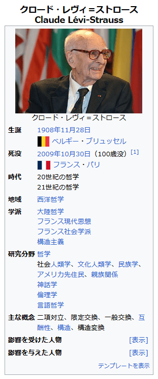 ^ 在日フランス大使館公式サイトの記事「クロード・レヴィ=ストロースが100歳の誕生日」より(2010年1月29日更新、2017年3月1日閲覧)