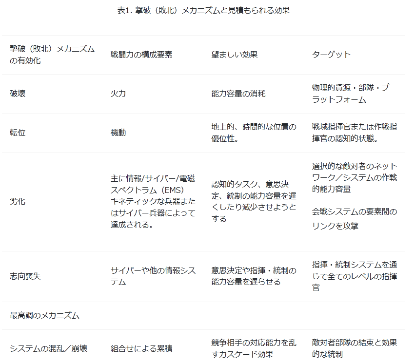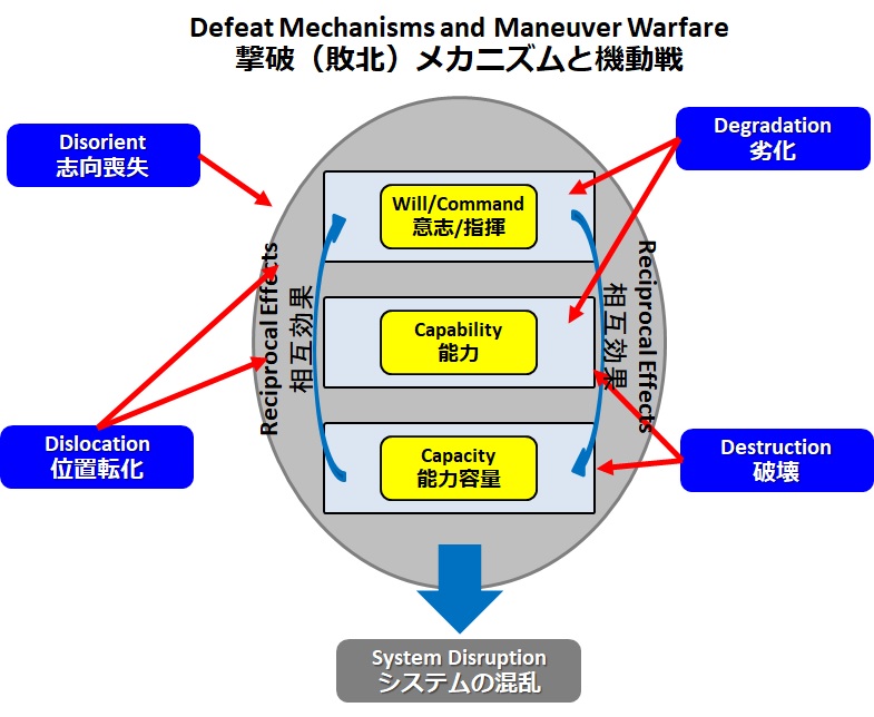 米陸軍は過去にドクトリンで「崩壊(disintegration)」を使用しており、その定義は「(指揮統制手段、インテリジェンス収集、重要なノードなどの)下位の構成要素を破壊する(destroying)または混乱させる(disrupting)ことによって敵(enemy)のシステムの一貫性を破壊し、敵の作戦遂行能力を低下させるとともに、敵(enemy)の能力や闘う意志(will to fight)を急速に崩壊させること」である[24]。