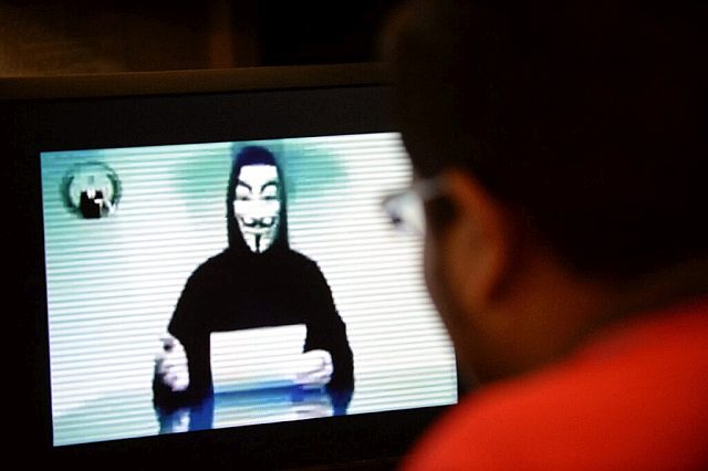 A person claiming to speak for activist hacker group Anonymous is seen issuing a warning throught a video circulated online to “go to war” with the Singapore government over recent Internet licensing rules on November 1, 2013. Activist group Anonymous hacked a Singapore newspaper website on November 1 and threatened wider cyber attacks over Internet freedom, with government agencies reportedly on alert after the group said it would “wage war” with the city-state. AFP PHOTO\ROSLAN RAHMAN (Photo by ROSLAN RAHMAN / AFP)