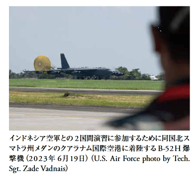 第2には、同盟国やパートナ一国と軍事 インドネシア空軍との2国間演習に参加するために同国北ス マトラ州メダンのクアラナム国際空港に着陸するB-52H爆 撃機(2023年 6月19 日)(U.S. Air Force photo by Tech. Sgt. Zade Vadnais) 的活動や作戦、戦略を統合することであり、こ れにより「敵の計画に不確実性と複雑性を加え る」としている”2。