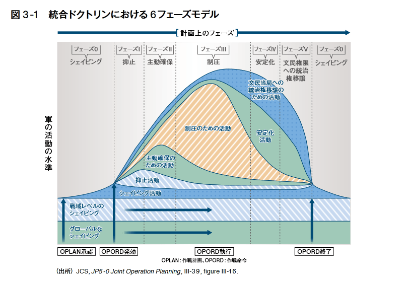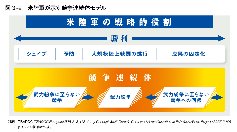 1の課題に対して米軍は、「航行の自由作戦」や情報・ サイバー空間での作戦行動に加え、あらゆる段階で米軍が一定の活動を行うことを示した「競争 連続体モデル」という新たな概念枠組みを形成して対応している。