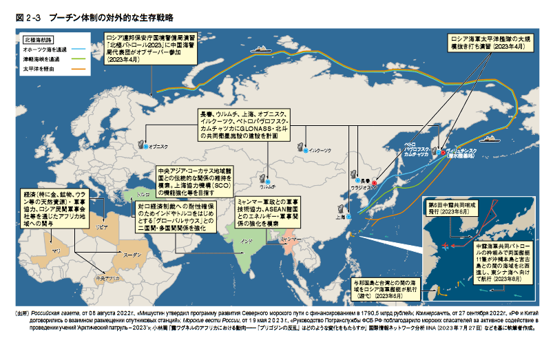 また、北極海航路につながるオホーツク海•日本海、さらに東シナ海といった日本周辺の海域 は、中国のみならず、米欧との激しい対立構図にあるロシアにとっても、経済制裁への耐性強化 という観点から、戦略的要衝としての価値は高まっている。